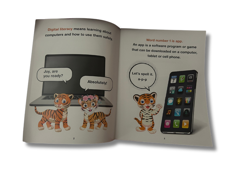 Techie Tiger Techie Tiger was written to provide students with the necessary vocabulary to become literate in the area of technology. Tom and Joy introduce the children to these words with beautiful explanations and illustrations.