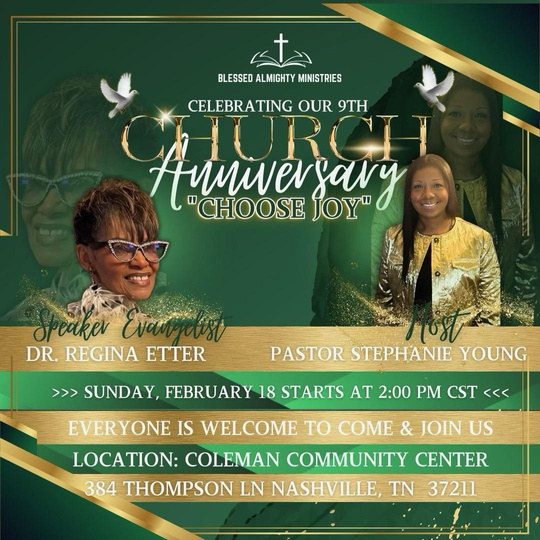 Dr. ReGina Etter was the guest speaker at the Blessed Almighty Ministries 9th Church Anniversary “Choose Joy” at the Coleman Community Center in Nashville,